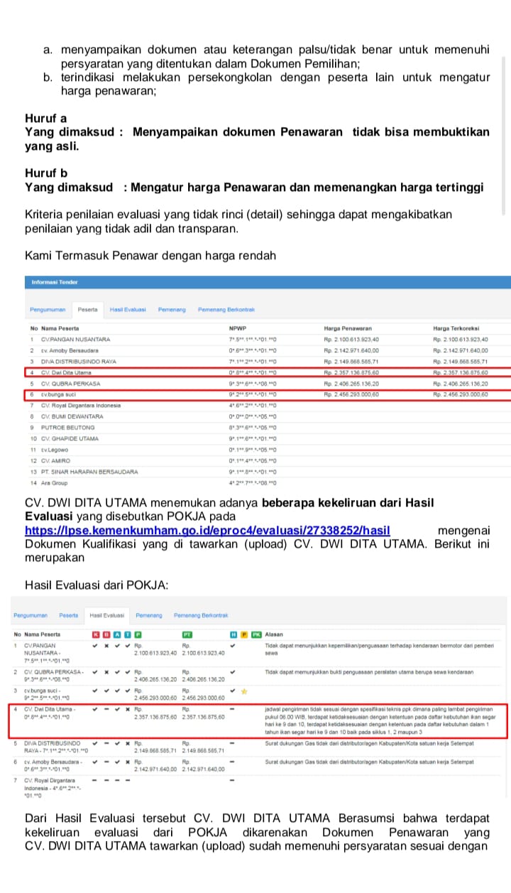 “Kemudian Ibnu menerima pengaduan dari salah satu peserta lelang, bahwa kami peserta pemilihan penyedia barang/jasa dengan Urutan hasil Peringkat Ke- 4 ( empat ) nilai penawaran Lebih Rendah CV. DWI DITA UTAMA dan merasa dirugikan. Sepertinya atau dugaan adanya indikasi penyalahgunaan wewenang dan penuh dengan rekayasa panitia POKJA atau ULP dan/atau pejabat yang berwenang , atau diduga adanya unsur indikasi persekongkolan sehingga menghalangi rekanan lain agar tidak terjadinya persaingan. Ujarnya